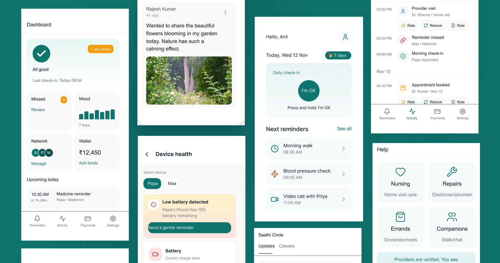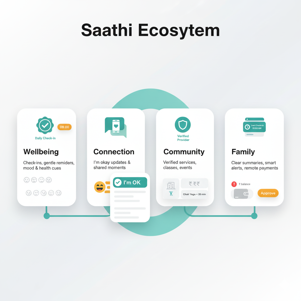SATHI (“companion”) connects seniors with their families through a simple, accessible experience: daily reassurance, reminders, verified services, and multilingual support.